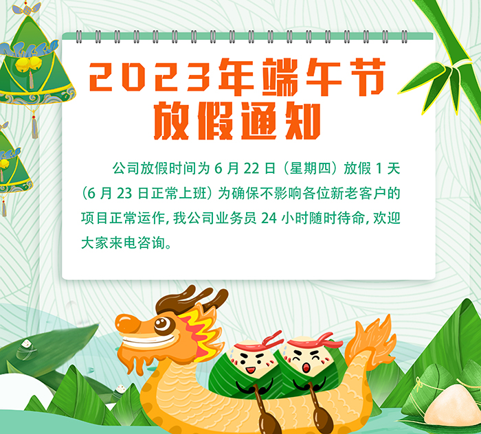 放假時(shí)間:6月22日(星期四)放假1天:(6月23日正常上班)為確保不影響各位新老客戶的項(xiàng)目正常運(yùn)作,我公司業(yè)務(wù)員24小時(shí)隨時(shí)待命,歡迎大家來電咨詢,鑫華智能全體員工祝大家端午節(jié)安康。