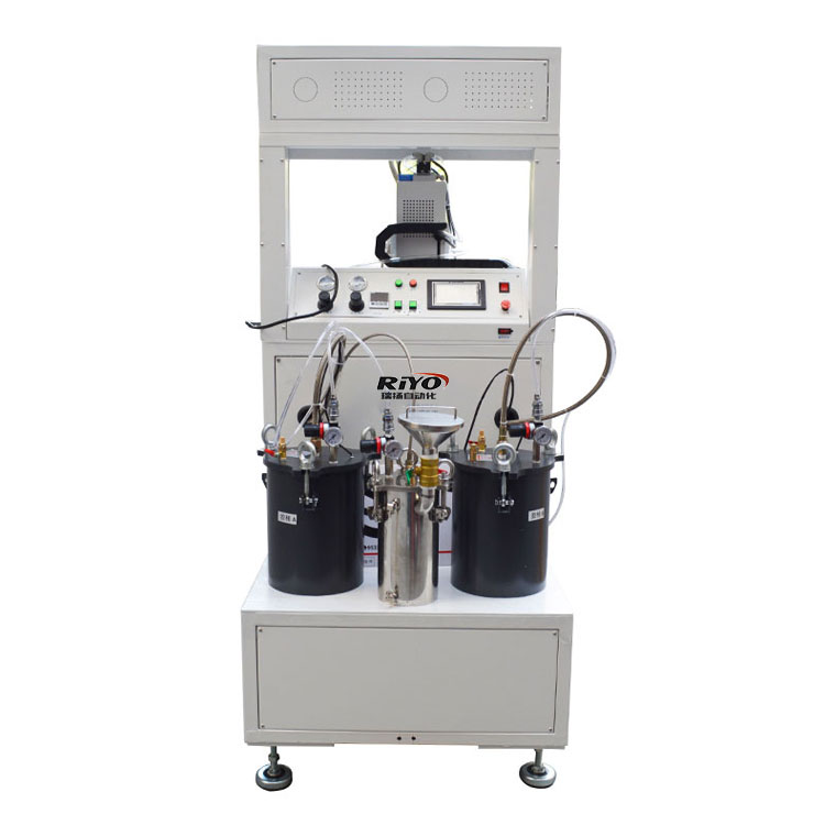 3、配膠部分操作簡便,您只需把AB膠分別倒進(jìn)相對(duì)應(yīng)的料桶里面,然后在PLC觸摸屏里設(shè)置好灌膠程序,按一鍵啟動(dòng),機(jī)器便可自動(dòng)灌膠,每個(gè)產(chǎn)品灌多少,機(jī)器就自動(dòng)配多少,有效節(jié)約膠水;